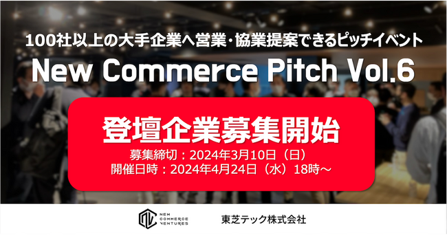 小売・流通のDXを支援するNew Commerce Ventures株式会社(本社:東京都品川区、代表取締役:松山馨太・大久保洸平、以下NCV)は、東芝テック株式会社(本社:東京都品川区、代表取締役:錦織弘信、以下東芝テック)と共催で小売・流通領域のスタートアップと事業会社を繋ぐピッチイベント『New Commerce Pitch Vol.6』を2024年4月24日に開催します。これに伴い、本日よりピッチ登壇企業の募集を開始します。