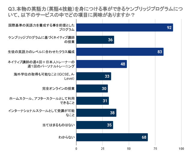 Q3で「本物の英語力(英語4技能)を身につける事ができるケンブリッジプログラムについて、以下のサービスの中でどの項目に興味がありますか?(複数回答可)」と質問したところ、北海道で最も多かったのは「国際基準の英語力を養成する事を前提としたプログラム」で92名でした。次いで、「生徒の英語力のレベルに合わせたクラス編成」には83名、「ネイティブ講師の週4回+日本人トレーナーの週1回のパーソナルトレーニング」には48名が興味を持っています。一方で、「ホームスクール、アフタースクールとして利用できること」や「完全オンラインの授業」に関心を持つ人はやや少なめで、それぞれ31名、30名の回答でした。これらの結果から、多くの人は実用的な英語力の養成や個別のニーズに応じた指導に重きを置いていることが伺えます。