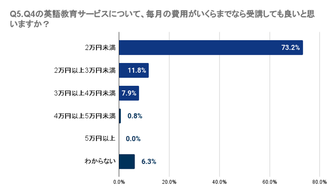 Q4で「受講したい」「料金が安ければ受講したい」「興味がある」と回答した人に、Q5で、「Q4の英語教育サービスについて、毎月の費用がいくらまでなら受講しても良いと思いますか?」と質問したところ、最も多い73.2%の回答者は2万円未満が適切と感じています。11.8%は2万円以上3万円未満、7.9%は3万円以上4万円未満と答えました。対照的に、4万円以上の費用を考える回答者は極少数で、4万円以上5万円未満が0.8%、5万円以上が0.0%でした。これにより、北海道では多くの人が3万円未満の価格帯を望んでいることが明らかとなりました。
