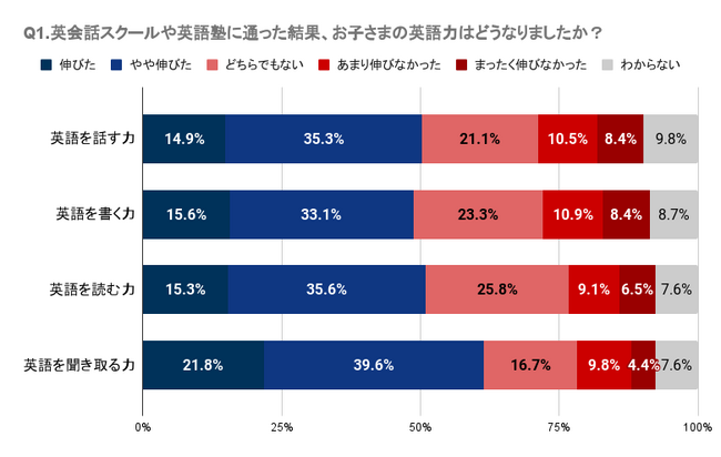 Q1で「英会話スクール、英語塾に通った結果、お子さまの英語力はどうなりましたか?」と質問したところ、北海道では英会話スクールや塾に通って英語のスキル向上を明確に感じられなかったと感じている人が一定数いることが分かりました。具体的には、英語を話す、書く、読む、聞き取る各スキルにおいて、「伸びた」と感じる人は14.9%~21.8%であり、一方で「あまり伸びなかった」や「まったく伸びなかった」と回答した人が合わせて14.2%~19.3%となっています。特に、「英語を話す力」と「英語を書く力」においては「あまり伸びなかった」と「まったく伸びなかった」の合計がそれぞれ18.9%、19.3%となっています。また、各スキルに関して「どちらでもない」と答えた人も含めると、30.9%~42.5%となっており、明確な効果を実感していない人が一定数存在することが伺えます。