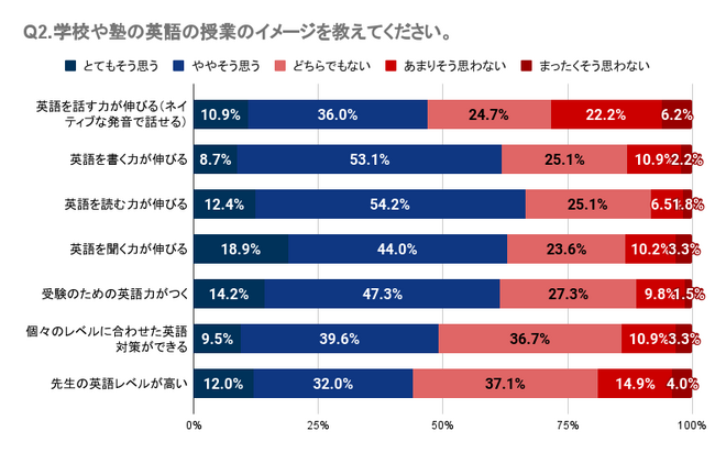 Q1・Q2では、子どもが英会話スクールや英語塾に通っていたが英語力アップの効果を感じていない人が一定数いること、学校や塾の英語の授業に対して明確な効果や良い印象を持てていない人が多いことが明らかになりました。