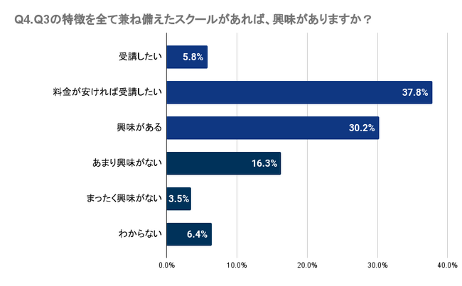 Q4で「Q3の特徴を全て兼ね備えたスクールがあれば、興味がありますか?」と質問したところ、北海道では5.8%が受講を希望し、37.8%は料金が手頃であれば受講したいと考えています。さらに、30.2%は興味を示していると回答しました。多くの人がこのような特徴を持つスクールに一定の興味を示していることが分かります。