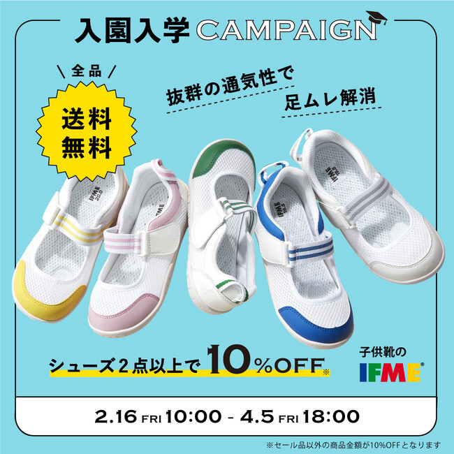 期間中、対象店舗でのシューズ購入がお得となるキャンペーンとなっております。定番のスニーカー商品はもちろん、春夏の新作モデルから、これからのシーズンの必需品となる上履き商品・サンダル商品まで、すべてのシューズが対象となったキャンペーンです。新学期・新生活を彩るお靴を、ぜひこの機会にお買い求め下さい。