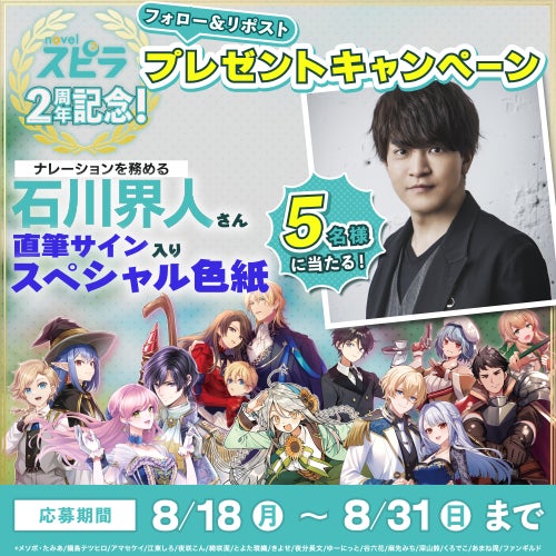 novelスピラ創刊2周年を記念して、ナレーションを務める「石川界人さん直筆サイン入りスペシャル色紙」が5名様に当たるキャンペーンを実施いたします!