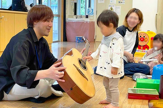 ギターの生演奏では、演奏が終わるたびにギターに近づいてきて、弦に触れたり、ボディーを叩いてみたり、ペグ(弦を巻くネジ)を回そうとしてみたり、始めて見るギターに興味津々の様子でした。