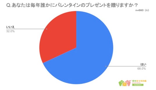 10代から60代以上までの回答者660人に「毎年バレンタインにプレゼントを贈るか」について聞いたところ、「はい」が449人で68%、「いいえ」が211人で32%という結果になりました。7割弱の人が、バレンタインをきっかけにして何かしらのプレゼントを誰かに贈っていることがわかります。