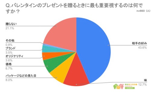 最後に、「バレンタインのプレゼントで重視すること」について聞いたところ、1位が「相手の好み」で288人(43.6%)、2位が「味」で84人(12.7%)、3位が「パッケージなどの見た目」で53 人(8%)という結果になりました。プレゼントを決める際には、ブランドや価格よりも相手の好みでプレゼントを選んでいる人が多いことがわかります。
