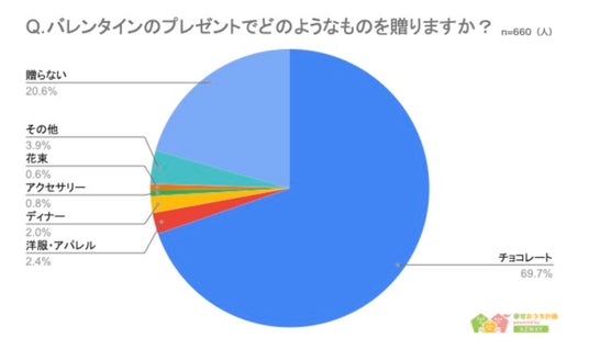 続いて、「バレンタインに贈るプレゼントの内容」について聞いたところ、「チョコレート」と答えた人が1番多く460人(69.7%)という結果に。2位が「洋服・アパレル」で16人(2.4%)、3位がディナーで13人(2%)と続きますが、チョコレートとは30倍近くの開きがあり、「バレンタインの贈り物=チョコレート」がいまだに定番であることがわかります。