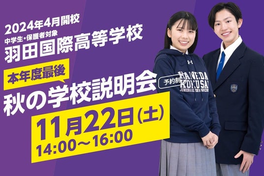 そして「秋の学校説明会」は11月22日(土)に最終回を迎えます。校長より教育コンセプト・教育方針に加えて、本校独自のグローカルキャリア教育であるWINGSプログラムをご説明するほか、教員陣より、HANEDA留学※を中心とした「国際教育」、羽田国際が誇る探究授業「WINGS探究」や、「コース紹介」「学校生活」などをご説明します。また希望者向けに校舎見学やご質問コーナーもご用意しております。羽田国際の教育内容を知りたい方は、ぜひご参加ください!