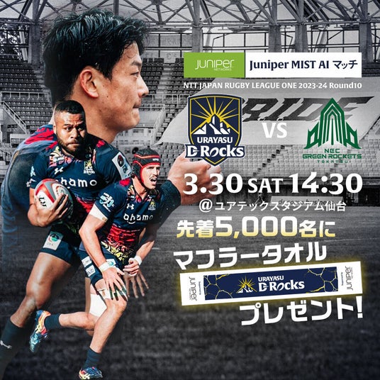 また、本契約に伴い、2024年3月30日(金)に行われるNTT JAPAN RUGBY LEAGUE ONE 2023-24 DIVISION2 第10節 NECグリーンロケッツ東葛戦のマッチスポンサーとしてジュニパーネットワークスの協賛が決まりました。本試合を、「Juniper MIST AI マッチ(ジュニパー ミストAI マッチ)」として開催します。