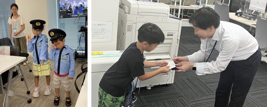 メインプログラムの職場見学では、大人が多くいるオフィスを見て緊張している子供や普段とは違うお父さんやお母さんの働く姿を見て、何かを感じたようで子供たちは興味津々にオフィス内を見学し、緊張しながらも初めての名刺交換の体験をしてオフィス内は和やかな空気が流れました。