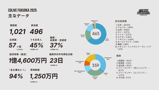 「Colive Fukuoka 2025」には、アメリカ、台湾、タイなど世界57の国と地域から1,000名以上が事前登録し、うち496名が福岡を訪れました。参加者は平均23日間の滞在(最大累計130日)を通じて、約1.4億円の地域経済効果を福岡にもたらしたと推定されます。