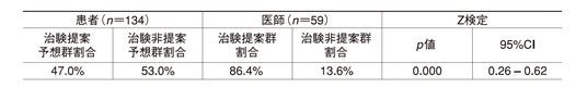 一方で、「主治医が治験を提案してくれる」と予想した患者さんは42.5%でしたが、実際に「(情報を得られれば)提案する」と回答した医師は86.4%に達しました。医師の治験提案に対する意欲は、患者さんの予想よりも有意に高く、ここにも大きなギャップがあることが示されました(p=0.000,95%CI:0.26‒0.62)。