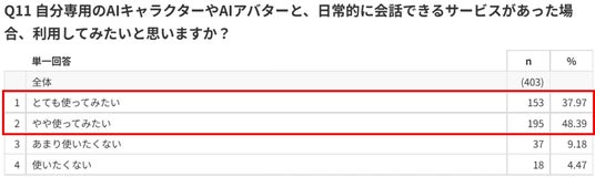 個人専用のAIアバターに対する利用意向は約86%、AI相談サービスの利用意向も約88%と高く、AIは現実的な相談手段として受け入れられつつあります。