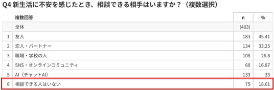 努力するあなたの“絶対的な応援団”を掲げる株式会社AIアバター(本社:東京都千代田区、代表取締役:加藤一郎、以下「当社」)は、全国の10代~50代男女403名を対象に「新生活の不安と相談行動に関する意識調査」※¹を実施しました。