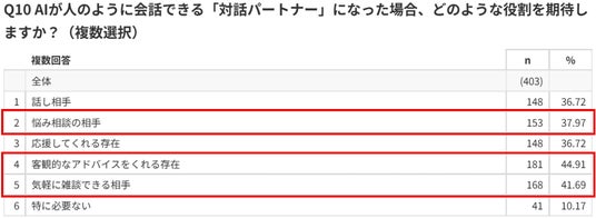 AIに期待する役割としては、「客観的なアドバイス」「気軽な雑談」「悩み相談」などが上位となり、実用性と心理的サポートの両方が求められていることが明らかになりました。