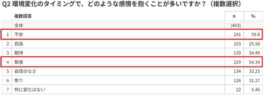新生活において「不安」(59.8%)や「緊張」(54.3%)を感じる人が過半数を占め、環境変化により心理的負荷が生じていることがうかがえます。