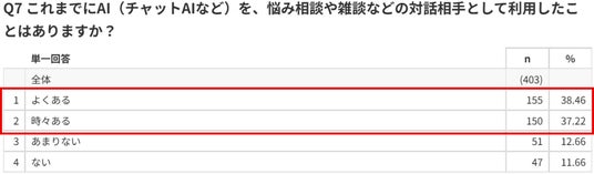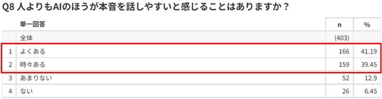 「AIのほうが本音を話しやすい」と感じた経験がある人は約8割に達し、AIは心理的ハードルの低い相談相手として機能していることが示されました。