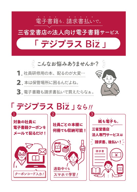 株式会社三省堂書店(本社:東京都千代田区・代表取締役社長:亀井 崇雄)は、企業向けの電子書籍購入サービス「デジプラスBiz」の提供を開始します。企業活動における人材育成の重要性がますます高まっている昨今、国内最大級の総合電子書籍ストア「ブックライブ」と協業のうえ、電子書籍を請求書払いで一括購入できるサービス「デジプラスBiz」β版をご用意しました。経理担当者や人事担当者の手間も大幅に削減。社員のスキルアップや福利厚生のための読書を促進し、企業の生産性向上に貢献いたします。