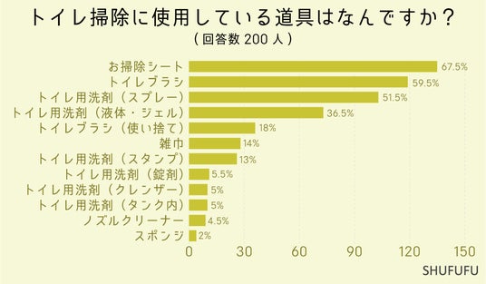 トイレ掃除に使用している道具に関しては1位「お掃除シート(67.5%)」、2位「トイレブラシ(59.5%)」でした。近頃のお掃除シートは流せるタイプが多いので、さっと掃除しやすいですもんね。またトイレブラシも使い捨てを使っているという方が18%いらっしゃいました。