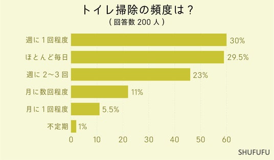 トイレ掃除の頻度は?の問いに対して最も多かったのが「週に1回程度(30%)」でした。 次いで「ほとんど毎日(29.5%)」「週に2~3回(23%)」という結果でした。 不定期と答えた方を除けば「月に1回程度」と答えた方が最長期間だったので、基本的にこまめに掃除をされている方がほとんどのようです。