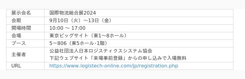 NIPPON EXPRESSホールディングス株式会社(社長:堀切智)のグループ会社、日本通運株式会社(社長:竹添進二郎)は、9月10日(火)~9月13日(金)の4日間、東京ビッグサイトで開催される「国際物流総合展2024」 に出展します。