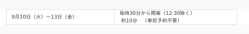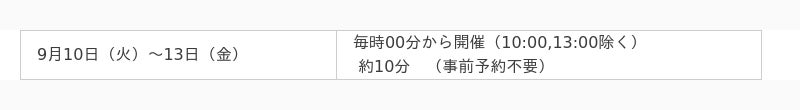 9月10日(火)~13日(金): 各10分 (事前予約不要)