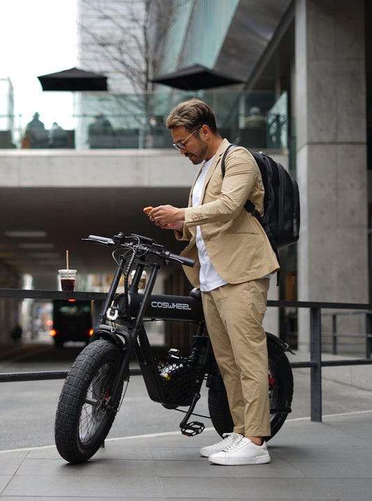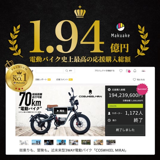 アメリカンスタイルのCOSWHEEL E-BIKEは、アメリカ・ヨーロッパを始め世界で10万人以上の方に愛されています。COSWHEEL MIRAIとして日本に上陸し、2022年クラウドファンディングサイトMakuakeでは、電動バイクカテゴリーとしてNo.1の応援購入総額1.94億万円を記録。ファットタイヤ電動バイクの先駆けとして人気を博しました。