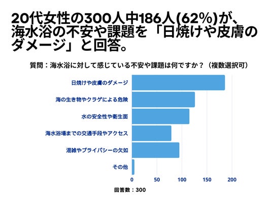 20代女性の300人を対象とした「海水浴に対して感じている不安や課題は何ですか?」というアンケートで186人(62%)が「日焼けや皮膚のダメージ」という結果になりました。