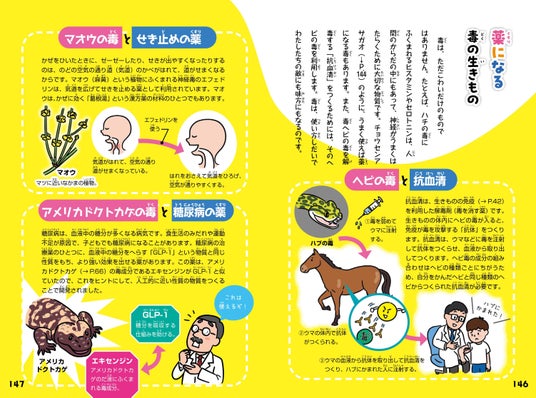 毒の種類と効果、人間には無害な毒、薬になる毒などの役立つコラムや、世界中のハチにわざと刺されたり、ヒアリに自分をかませたりして痛さを測ったイグ・ノーベル賞生物学者のシュミット博士の話などの楽しいコラムもたくさん掲載しています。