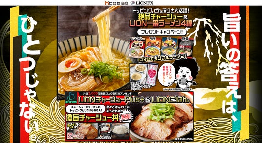 ヒロセ通商株式会社 (本社:大阪府西区、代表取締役:野市 裕作、以下:当社)は、当社の提供する「LION FX」において、2025年7月1日(火)より、「トッピング、どんぶりと大活躍!絶品チャーシュー&LION一番ラーメン4種プレゼントキャンペーン」を実施することをお知らせいたします。