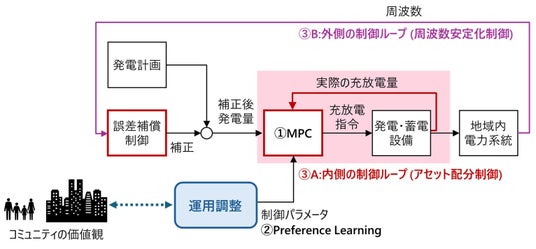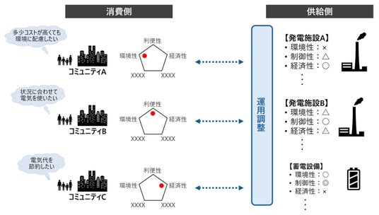 図2 コミュニティの多様な価値観をリアルタイムで反映しながら仮想発電所を最適に制御する技術