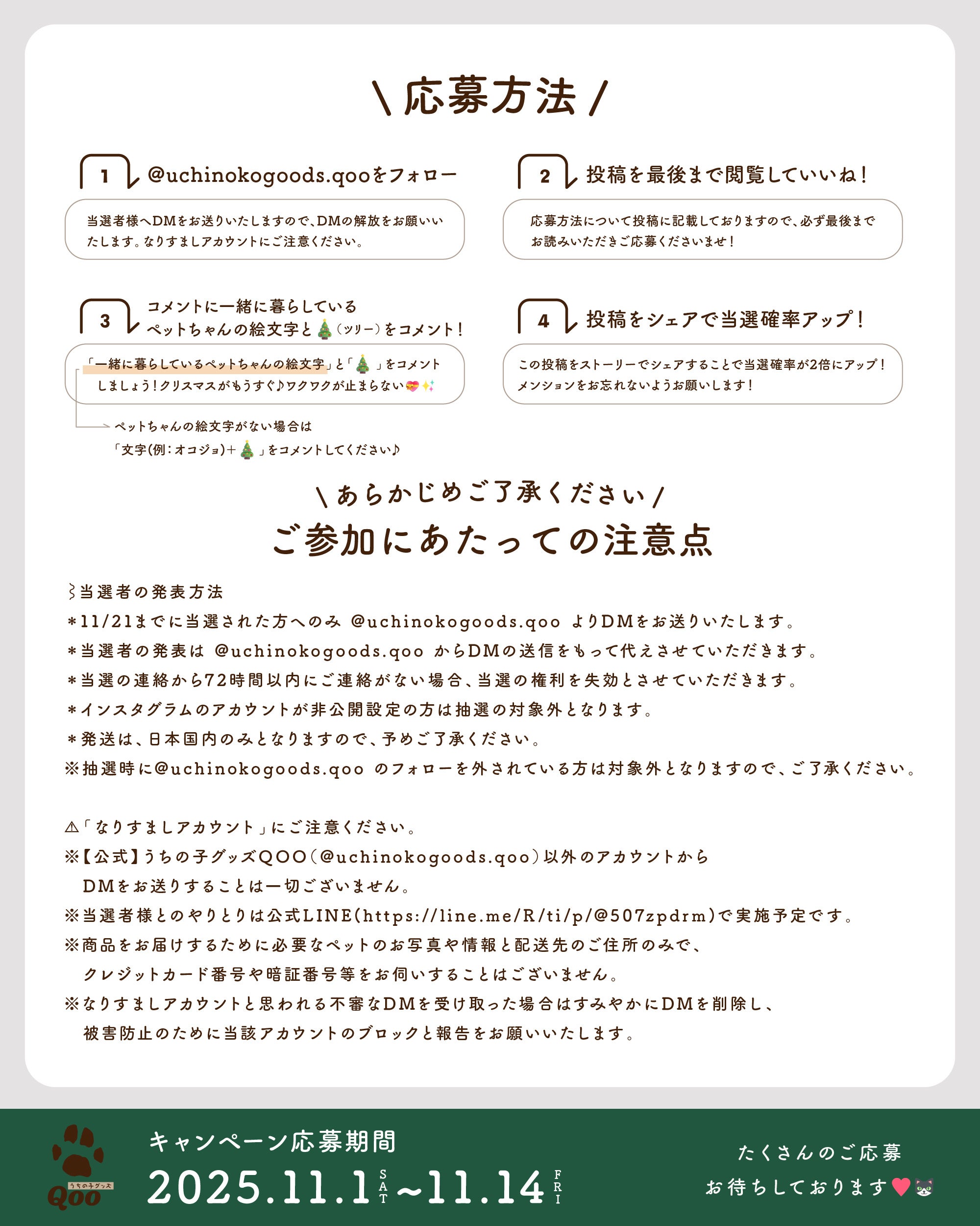 - 公式Instagramアカウント( @uchinokogoods.qoo )を「フォロー」。