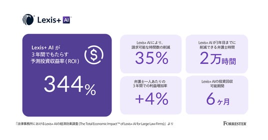 「法務・コンプライアンス業務を変革する」を掲げ、世界150カ国以上のビジネスで培った法令情報データベースとテクノロジーを掛け合わせ、「ASONE(R)」「Lexis+ AI(TM)」などのリーガルSaasプロダクトを提供する レクシスネクシス・ジャパン株式会社 (本社:東京都中央区、代表取締役社長:パスカル ロズィエ、以下当社) は、2025年5月13日に、Forrester社による「法律事務所におけるLexis+ AIの経済効果調査 (The Total Economic Impact(TM) of Lexis+ AI for Large Law Firms)」を発表しました。