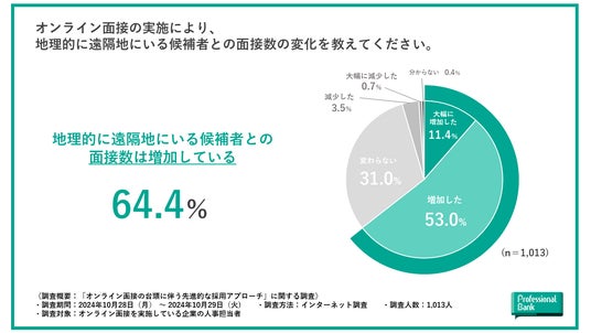 オンライン面接によって、6割以上の企業が地理的に遠隔地にいる人材との「面接数が増えた」と回答