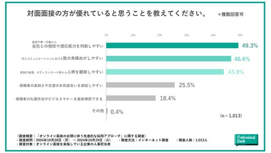 最後に、オンライン面接を導入する企業の人事担当者が思う、対面面接の方が優れている点を聞いてみました。