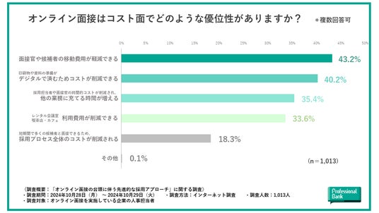 この質問の回答はどれも拮抗し、上から『面接官や候補者の移動費用が軽減できる(43.2%)』『印刷物や資料の準備がデジタルで済むため、コストが削減できる(40.2%)』『採用担当者や面接官の時間的コストが削減され、他の業務に充てる時間が増える(35.4%)』『レンタル会議室や喫茶店・カフェの利用費用が削減できる(33.6%)』と続きます。