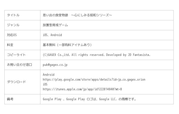 株式会社GAGEX(ガジェックス)(本社:東京都墨田区、代表取締役:井村 剣介)は、スマートフォン向けアプリ「思い出の食堂物語 ~心にしみる昭和シリーズ~」が、Google Playの「ベスト オブ 2017」ゲーム インディー部門に入賞したことをお知らせいたします。