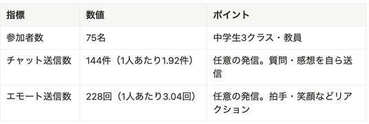「対面の外部講師を呼べない」「ウェビナーだと生徒が受け身になりがち」という課題は、すごろく型バーチャルキャリア教育が解決。チャット144件・エモート228回と、生徒参加型の体験の場を提供しました。