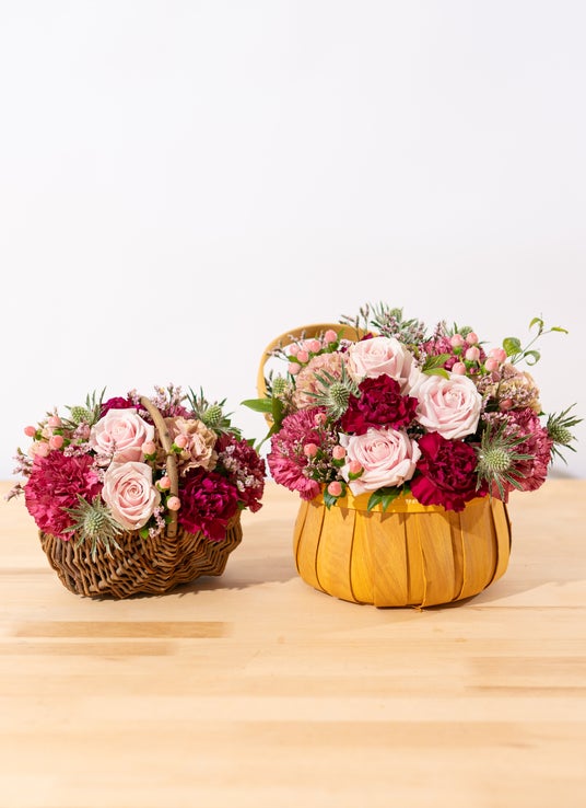 2.お花の印象に合わせたラッピング・器花束は、くすみ感のある色とホワイトの2色のラッピング紙に、たっぷりのラフィア(ペーパーリボン)を結ぶことで、ナチュラルで大人っぽいデザインで仕上げました。置き型のアレンジメントは、暖かみを感じられるバスケットと、お花の彩りを引き立てるシックなホワイトの器でお作りします。カラーやサイズによって最適な組み合わせでお作りします。