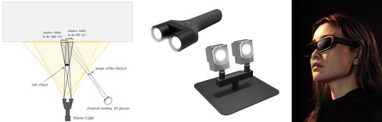 「ステレオライト(TM)」は、アブストラクトエンジンが独自開発した二眼投光器、およびその発光をアクティブシャッター方式の3Dメガネと同期させるシステムのこと。ステレオライト(TM)が生み出す影、反射光や透過光は3Dメガネ越しに見ると左右の目に異なる像となって映り、空中で結像するため、光や影が空間に浮き上がって見える没入的な視覚体験を生み出すことができる。2023年に発表した「”Syn : 身体感覚の新たな地平” by Rhizomatiks x ELEVENPLAY」で初披露されたオリジナルシステムである。