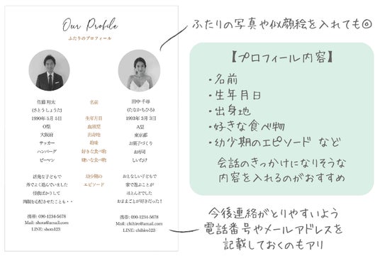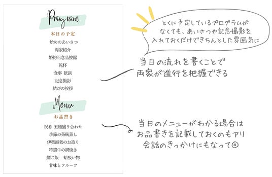 顔合わせのしおりは、顔合わせ当日の流れやお互いの家族の紹介などを上記のような冊子形式にしたものです。
