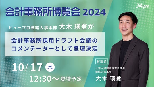 士業・管理部門に特化した転職プラットフォーム「ヒュープロ」を運営している株式会社ヒュープロ(本社:東京都渋谷区/以下、ヒュープロ)の・戦略人事本部大木瑛登が、株式会社ゼイカイが主催する「会計事務所博覧会2024」に登壇します。