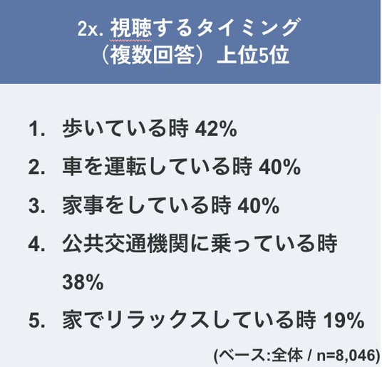 COTEN RADIOを視聴するシチュエーションとして、多くのリスナーが「ながら」聴きしていることが分かりました。移動中や家事など、様々なシーンで楽しんでいただいているようです。
