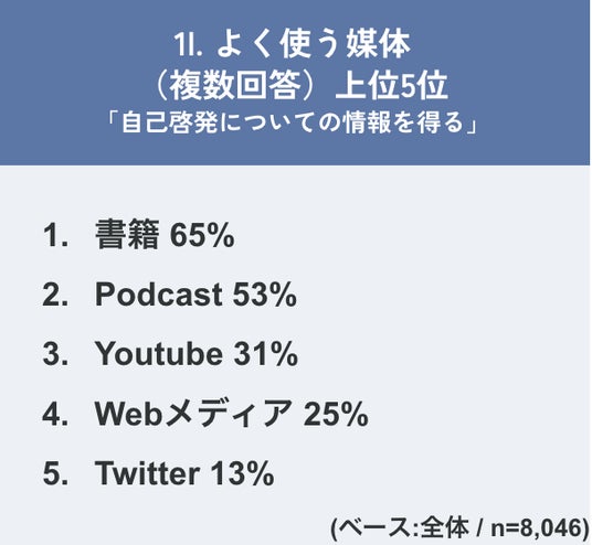 リスナーが自己啓発についての情報を得るためによく使う媒体の1位が「書籍」、2位が「Podcast」でした。