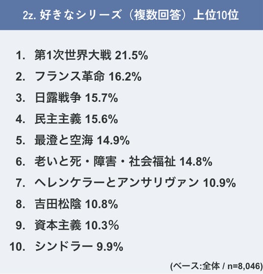2024年5月現在、50シリーズを超えているCOTEN RADIO。好きなシリーズを聞いたところ、1位は過去に実施したアンケートと変わらず「第1次世界大戦」となりました。社会の仕組みや歴史を構造的に捉えた作品が人気の傾向にあるようです。