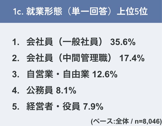 質問項目「就業形態」では半分以上が会社員で、特に17.4%が「会社員(中間管理職)」でした。30・40代のビジネスパーソンによく聞かれているコンテンツと言えそうです。
