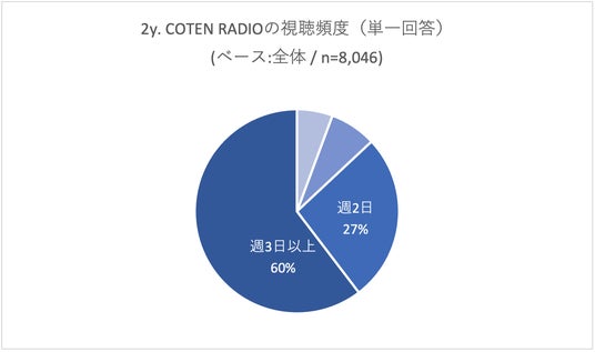 COTEN RADIOを週3回以上視聴するリスナーは60%、2日以上視聴するリスナーと合わせると87%という結果になりました。