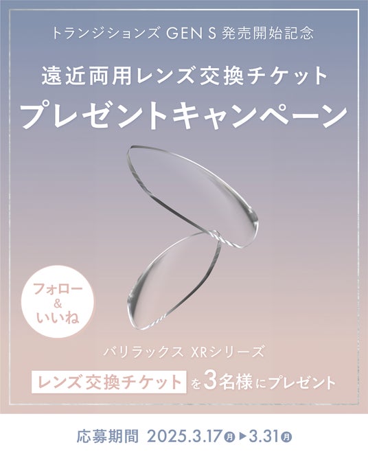 - プレゼント内容:遠近両用メガネレンズ「バリラックス XRシリーズ」のレンズ交換チケットをプレゼントいたします。お手持ちのメガネフレームに「バリラックス XRシリーズ」のレンズを入れ替えることができるチケットです。調光レンズ「トランジションズ GEN S」を組み合わせることも可能です。