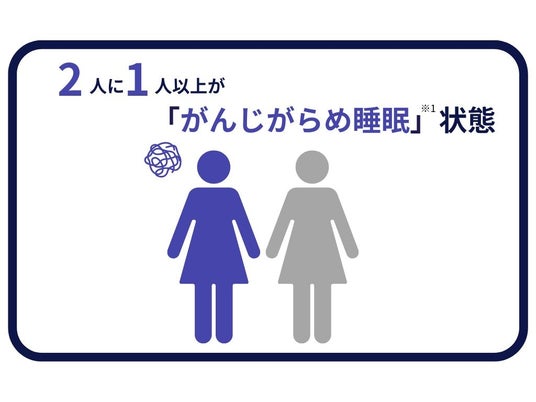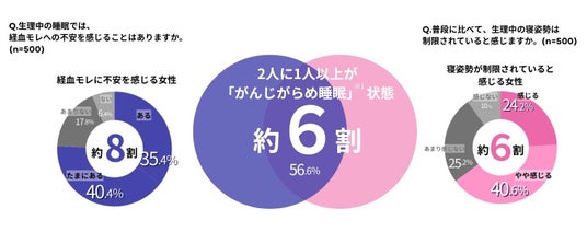 さらに「生理中の睡眠時にモレの不安を感じたことがある」「普段に比べて生理中の寝姿勢が制限されている」と両方に当てはまる状態を「がんじがらめ睡眠」※1と定義したところ、2人に1人以上の女性が精神的・身体的な両方で「がんじがらめ睡眠」※1の状態に陥っていることが明らかになりました。